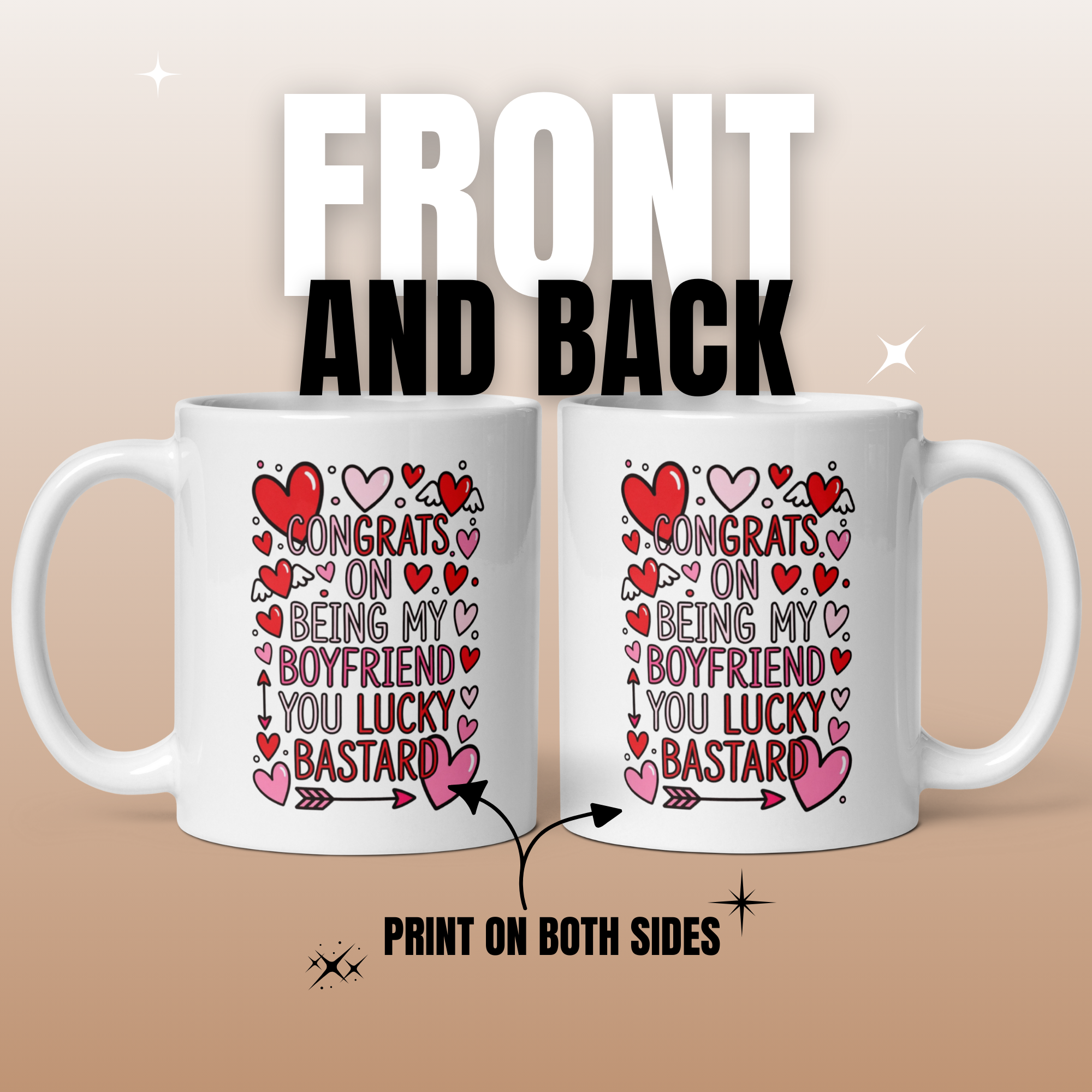 Cheeky & Romantic Design: Bold text “CONGRATS ON BEING MY BOYFRIEND YOU LUCKY BASTARD” surrounded by lovely decorative hearts, printed on both sides (perfect for lefties & righties)
