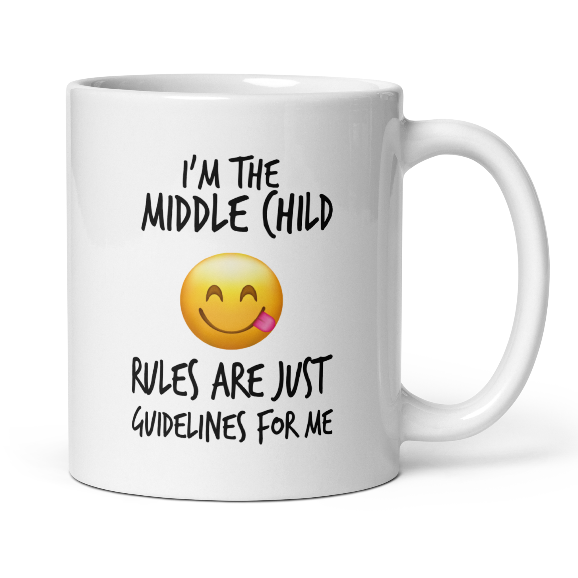 Middle child energy, unlocked! This hilarious I'm The Middle Child – Rules Are Just Guidelines To Me 11oz white glossy ceramic mug is part of our exclusive Child Siblings Rules Collection — the perfect way for middle kids to proudly declare their legendary status.